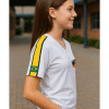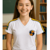 OMBRO DETALHE EM AMARELO ,FRISO AZUL MARINHO E LOGO BORDADO